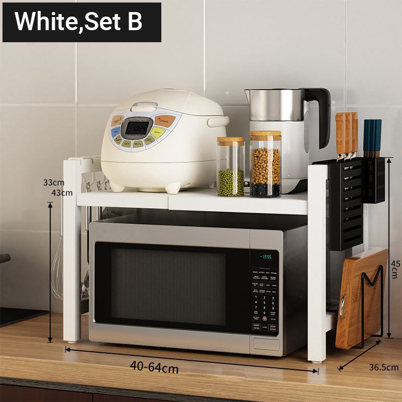 ERWEITERBARES DESIGN UND VERSTELLBARE HÖHE: Dieses Mikrowellengestell verfügt über ein erweiterbares Design, das sich von 40 auf 64 cm in der Länge anpassen lässt. Die Regalhöhe kann ebenfalls einfach um 10 cm verstellt werden, um Ihren Stauraum individuell zu gestalten.