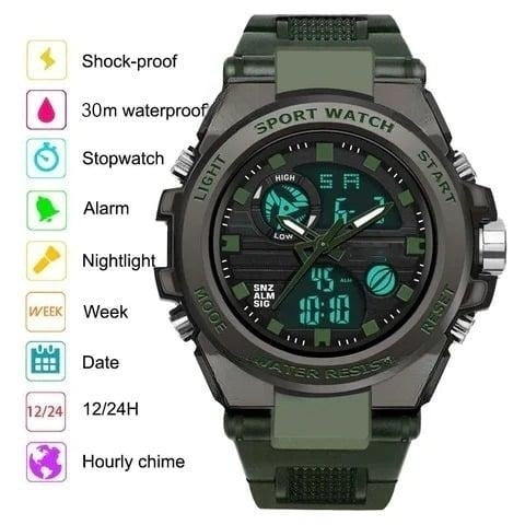 - Multifunktional: Duale Zeitanzeige, Datum, Woche, 12/24H, Stundenzeit, Alarm, Nachtlicht, Stoppuhr, 30m wasserdicht, stoßfest.